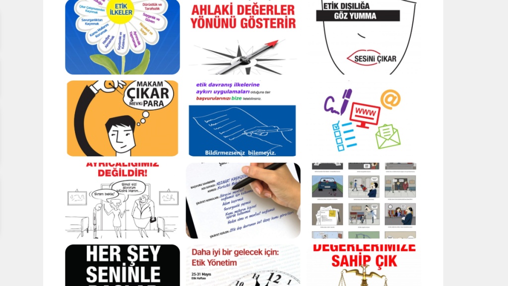 https://uzaktanegitimkapisi.cbiko.gov.tr/ ve https://www.etik.gov.tr/ bağlantılarında Cumhurbaşkanlığı iş birliği ile hazırlanan etik konulu sunumlar yer almaktadır. Ayrıca https://www.etik.gov.tr/yayinlar/afisler-posterler bağlantısında konuyla ilgili afiş ve posterlere ulaşılabilmektedir.
